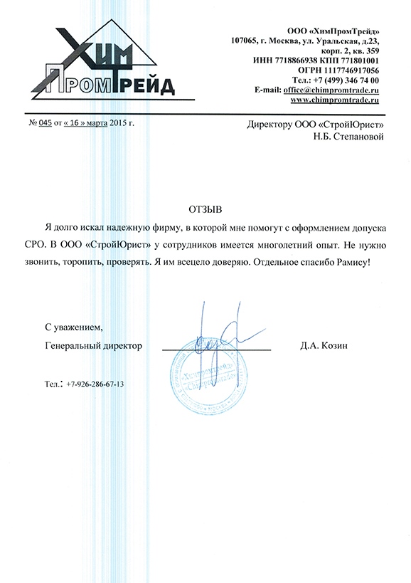 Отзывы клиентов "СтройЮрист" по вступлению в СРО в Йошкар-Оле